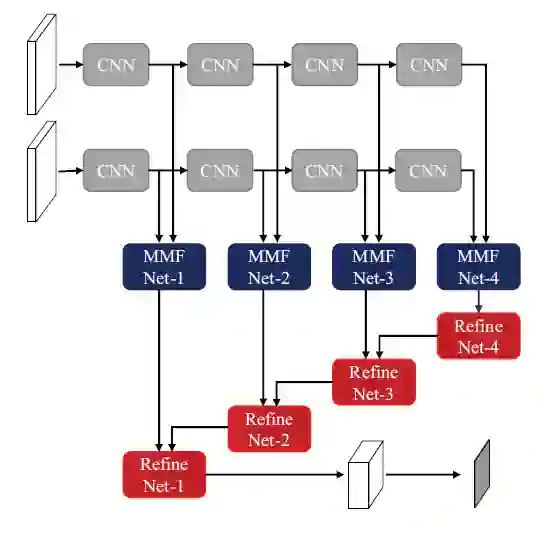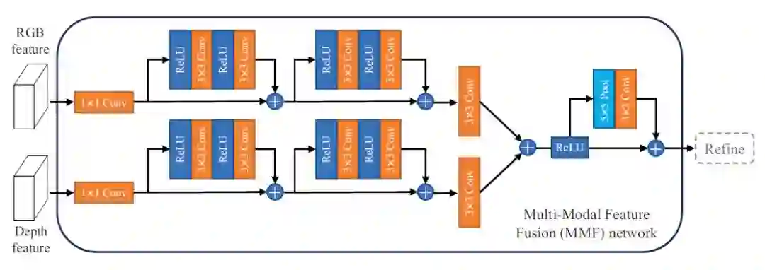 在使用RGB-D数据的多类别室内语义分割中,已经表明将深度特征结合到RGB特征中有助于提高分割的精度。然而,之前的研究没有充分利用多模态特征融合的潜力,比如他们只是简单地将RGB特征和深度特征连接起来,或者平均RGB和深度得分图。为了找到多模态特征的最优融合,作者提出了一种新的网络,将残差学习的核心思想拓展到RGB-D语义分割领域。作者的神经网络通过包含多模态特征融合block和多层级特征细化block,能过有效地提取RGB-D CNN特征。特征融合block通过学习RGB残差和深度特征及其之间的组合,来充分利用RGB数据和深度数据之间的互补特性。特征细化block通过学习来自多个层级的融合特征的组合,来实现高分辨率的预测。作者的神经网络通过充分利用skip-connections,可以从端对端的每种模态中有效的训练出有辨别力的多层级特征。作者的综合实验表明,其所提出的架构在两个具有挑战性的数据集中可以实现很好的精度,这两个数据集是NYUDv2和SUN RGB-D数据集。
