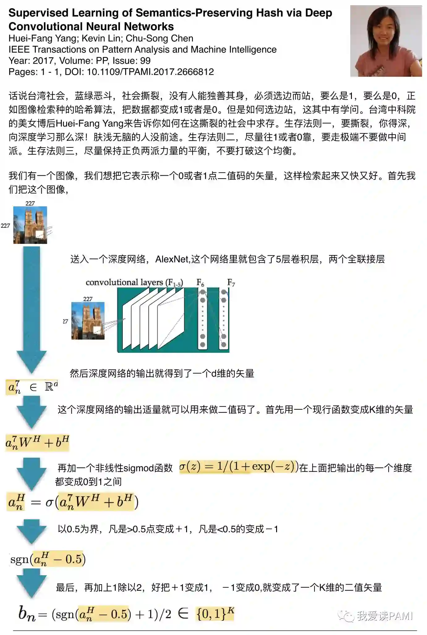 话说台湾社会,蓝绿恶斗,社会撕裂,没有人能独善其身,必须选边而站,要么是1,要么是0,正如图像检索种的哈希算法,把数据都变成1或者是0。但是如何选边站,这其中有学问。台湾中科院的美女博后Huei-Fang Yang来告诉你如何在这撕裂的社会中求存。生存法则一,要撕裂,你得深,向深度学习那么深!肤浅无脑的人没前途。生存法则二,尽量往1或者0靠,要走极端不要做中间派。生存法则三,尽量保持正负两派力量的平衡,不要打破这个均衡。