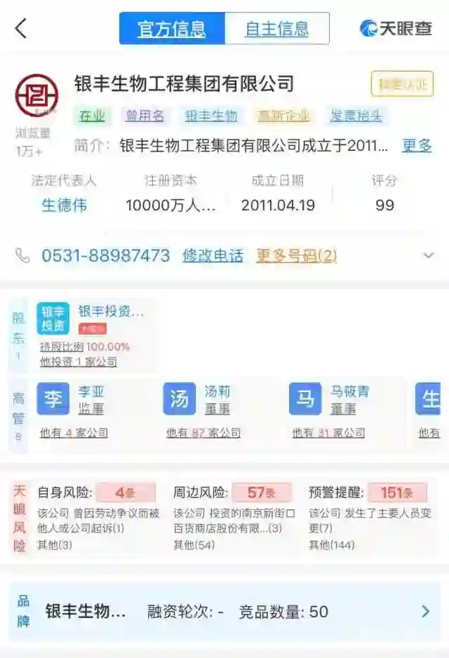 直到2004年7月,银丰集团才注册成立山东齐鲁干细胞工程有限公司,跨界进军生物医疗领域。该公司即为银丰生物工程集团有限公司的前身。银丰集团官网介绍,银丰生物主要从事人体细胞、组织、器官存储、基因测序技术、细胞技术研究和临床应用等高新技术开发。投资领域包括脐血储存、基因检测、细胞治疗、美容保健、天使医生(母婴监护健康管理平台)、低温医学。