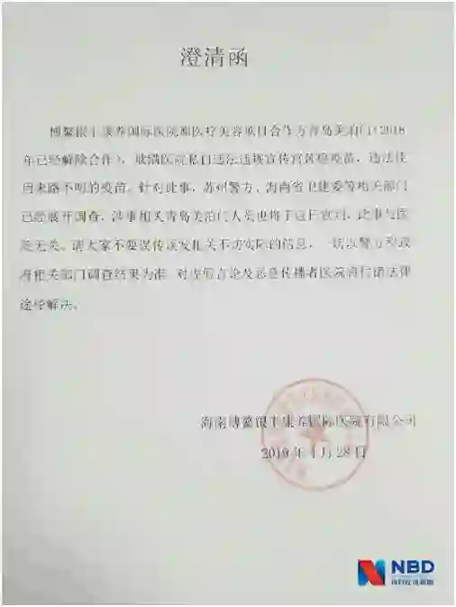 此外,记者从一名受害人处获悉,博鳌银丰康养国际医院给他们发来一份澄清函,称原医疗美容项目合作方青岛美泊门(2018年已经解除合作关系),欺瞒医院私自违法违规宣传宫颈癌疫苗,违法使用来路不明的疫苗。此事与医院无关。