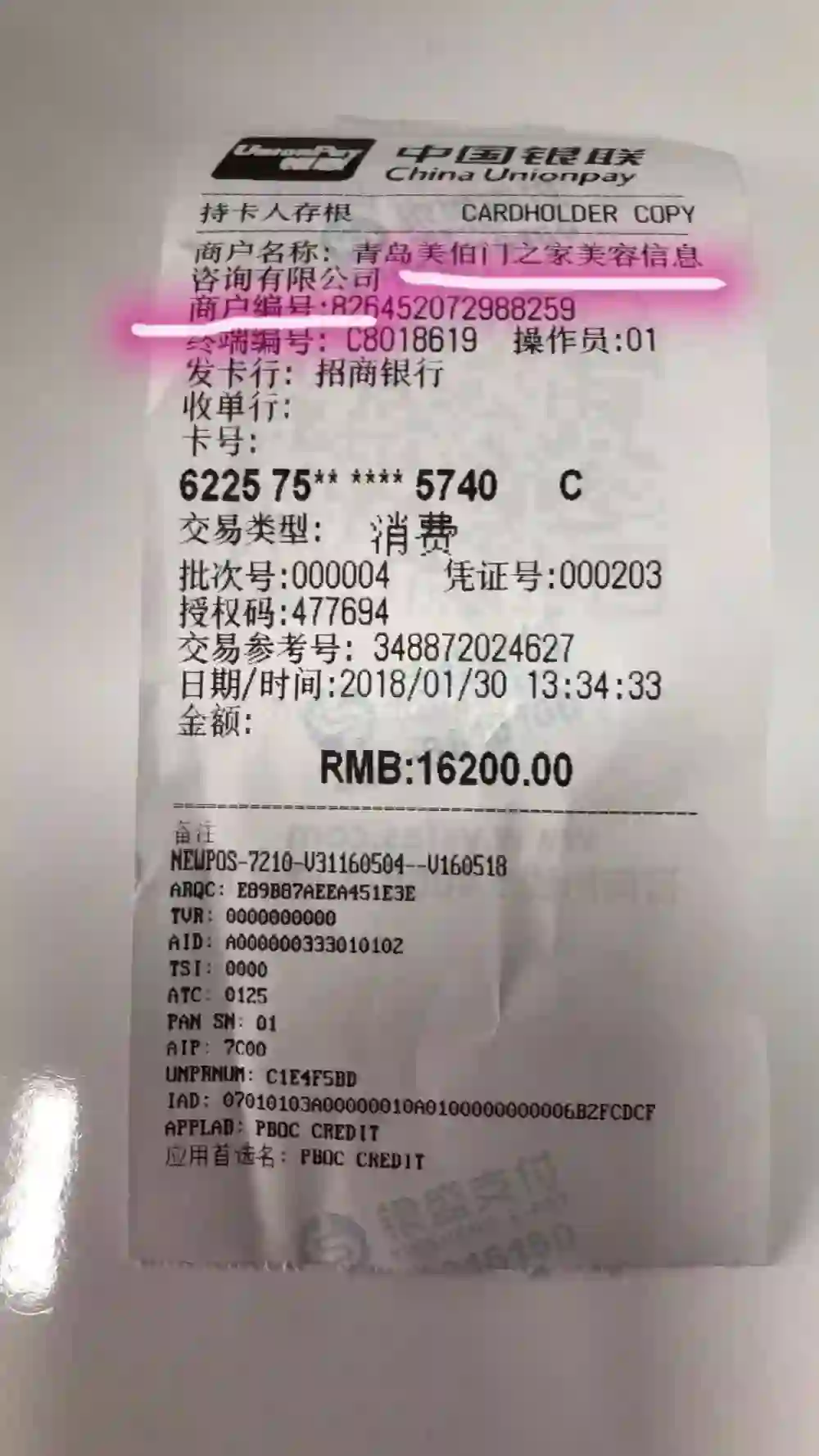 记者发现,该举报人上传的图片中,一张银联支付单上的商户名称为:青岛美伯门之家美容信息咨询有限公司。另一张电子付款信息显示,收款人为:青岛即墨市承达加油站。