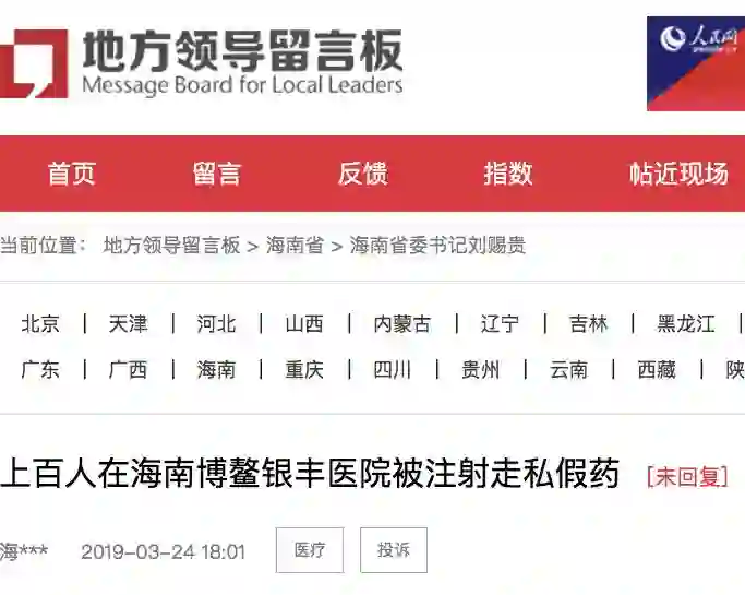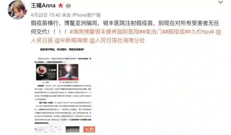除了在人民网地方领导留言板上的举报,4月22日,还有微博网友@王曦Anna爆料,自己在海南博鳌银丰康养国际医院注射的九价HPV疫苗被认定为假疫苗。