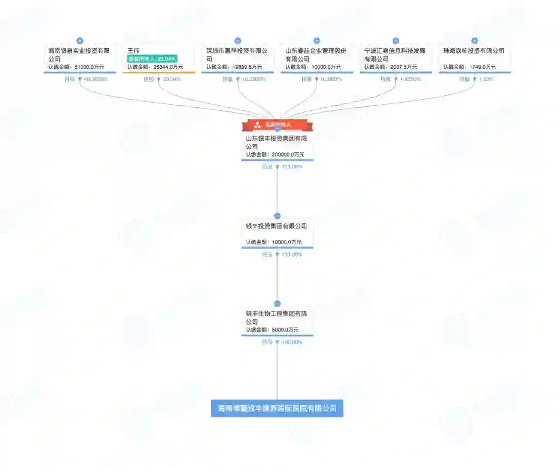 记者在查询启信宝发现,多家公司通过多层结构持有博鳌银丰康养国际医院股权,直接股东是银丰生物工程集团。除了这家医院,该集团还在全国多地开设了干细胞工程、生物工程、医疗科技相关公司。
