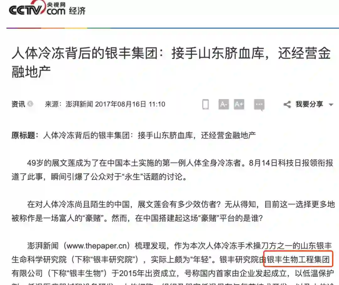 银丰生命科学研究院即银丰生物工程集团下属子公司。该研究院于2015年成立,号称国内首家由企业发起成立,以低温保护剂、低温医疗器械和设备研发、人体细胞、组织及器官低温保存与复苏技术开发,以及人体冷冻低温保存的专业研究机构。