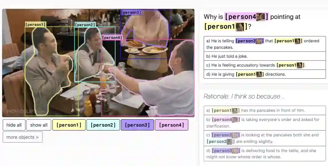 VisualCommonsense Reasoning (VCR)任务于2018年由华盛顿大学的研究人员首次提出,任务旨在将图像和自然语言理解二者结合,验证多模态模型高阶认知和常识推理的能力,让机器拥有“看图说话”的能力, 例如VCR能够通过图片中人物的行为,进一步推理出其动机、情绪等信息。