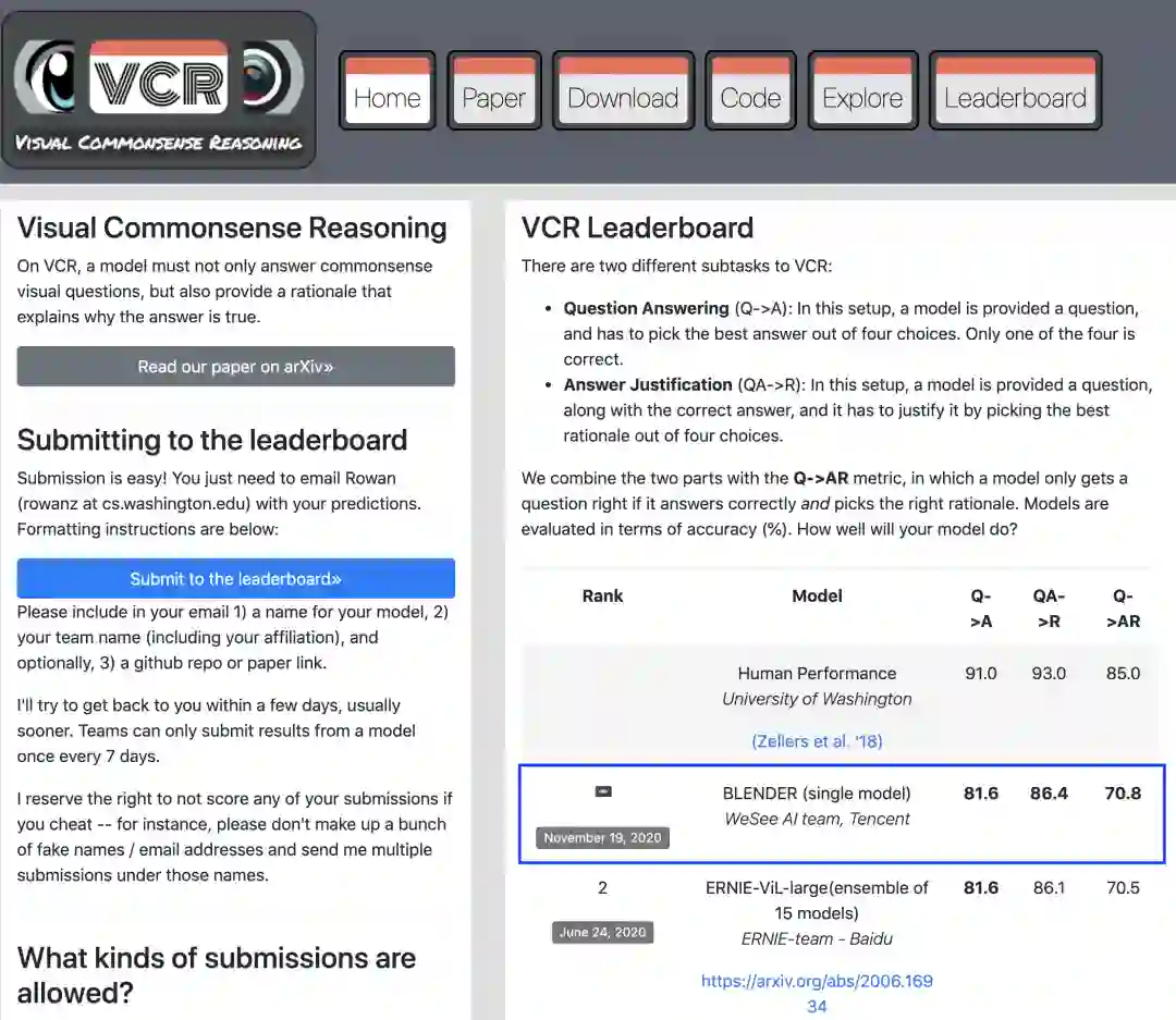 此次拔得头筹的单模型BLENDer来自腾讯微视视频理解团队,超越上一届榜首百度团队的多模态预训练模型 ERNIE-ViL-large成为新的VCR榜单霸主。