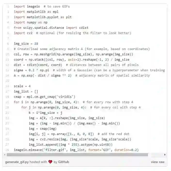 我们的图神经网络被证明是等同于具有单个高斯滤波器的卷积神经网络,在训练过程中我们从不更新,然后是完全连接的层。这个滤波器基本上显示模糊或是清晰的图像,这并不是一件特别有用的事情(见上图右边)。然而,这是图神经网络的最简单的变体,尽管如此,它在图结构的数据上仍然运行得很好。为了使GNN更好地在规则图上工作,(比如图像),我们需要应用一些技巧。例如,我们可以通过使用如下可微函数来学习预测任意一对像素之间的边,而不是使用预定义的高斯滤波器: