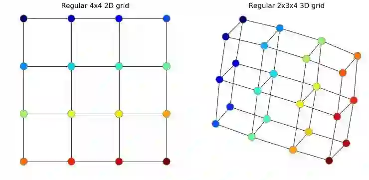 当我们在图像上训练神经网络或Convnet时,潜意识里我们在图上就已经将图像定义成了一个规则的2D网格,如下图所示。这个网格对于所有的训练和测试图像是相同且规则的,也就是说,网格的所有像素都以完全相同的方式在所有图像之间连接(即具有相同的连接数、边缘长度等),所以这个规则的网格图没办法帮我们从一幅图像中分辨出另一幅图像。下面我可视化了一些2D和3D规则网格,其中节点的顺序是彩色编码的。顺便说一句,我是在Python代码中使用了NetworkX来实现的,例如G=networkx.Grid_Graph([4,4])。