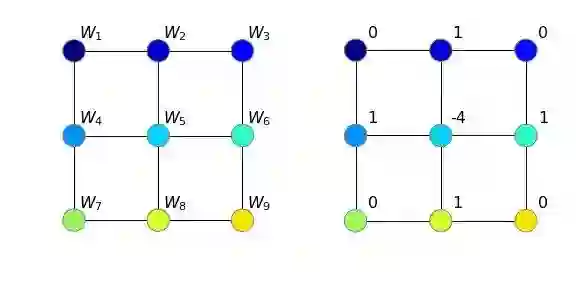 图7:在规则2D网格上的3×3滤波器的例子,左侧是任意权值w,右侧是边缘检测器。