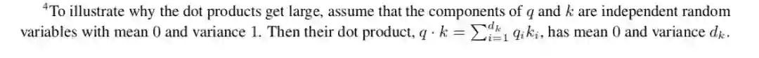 针对为什么维度会影响点积的大小,在论文的脚注中其实给出了一点解释: