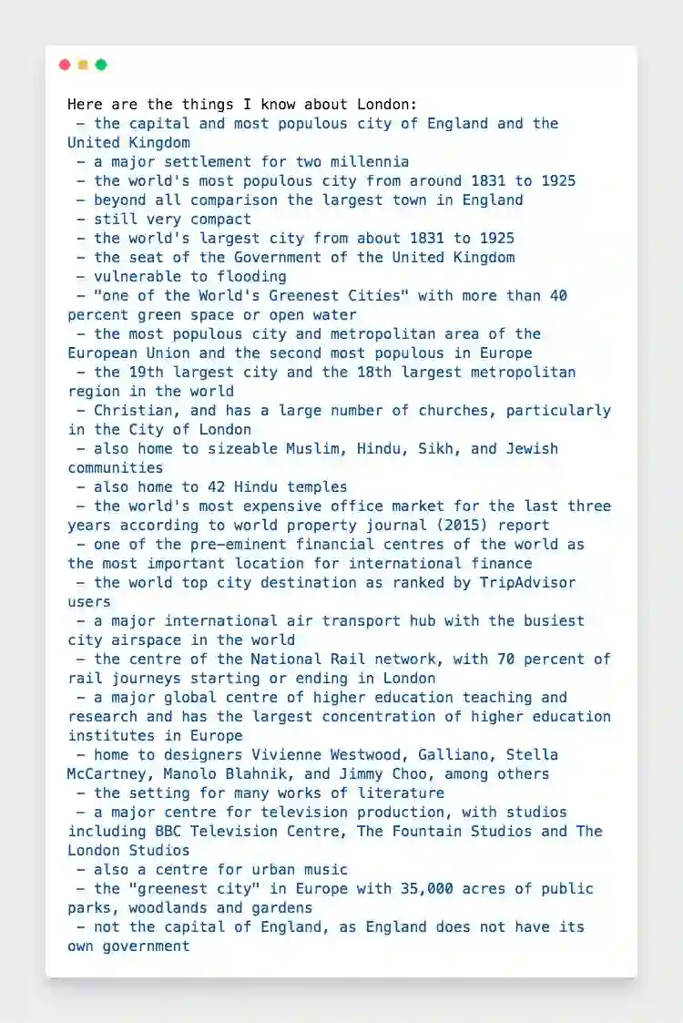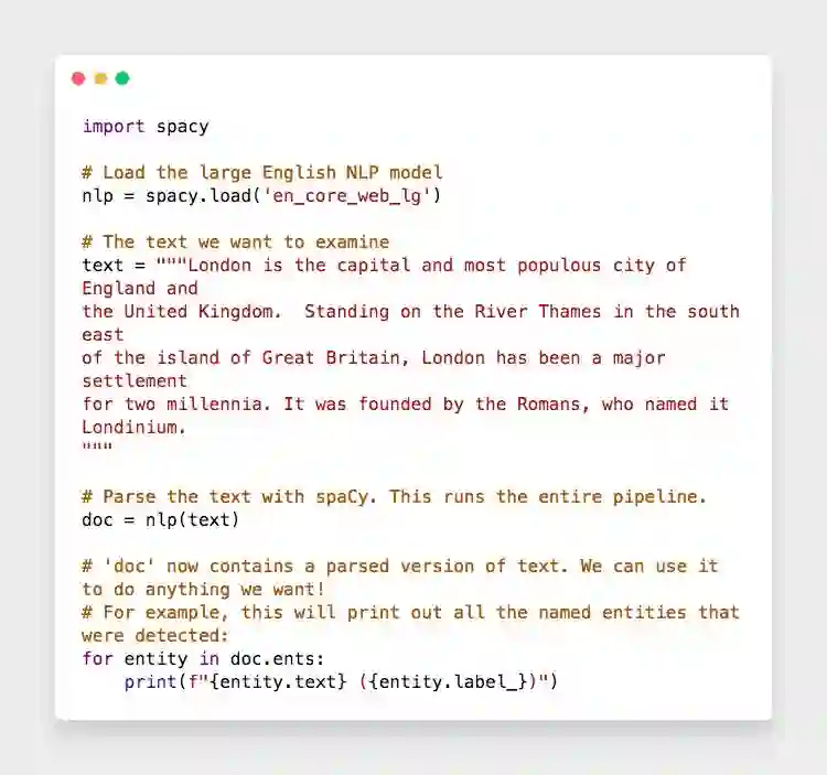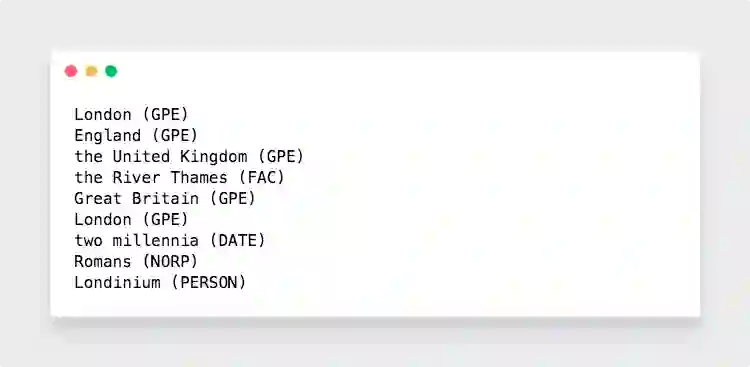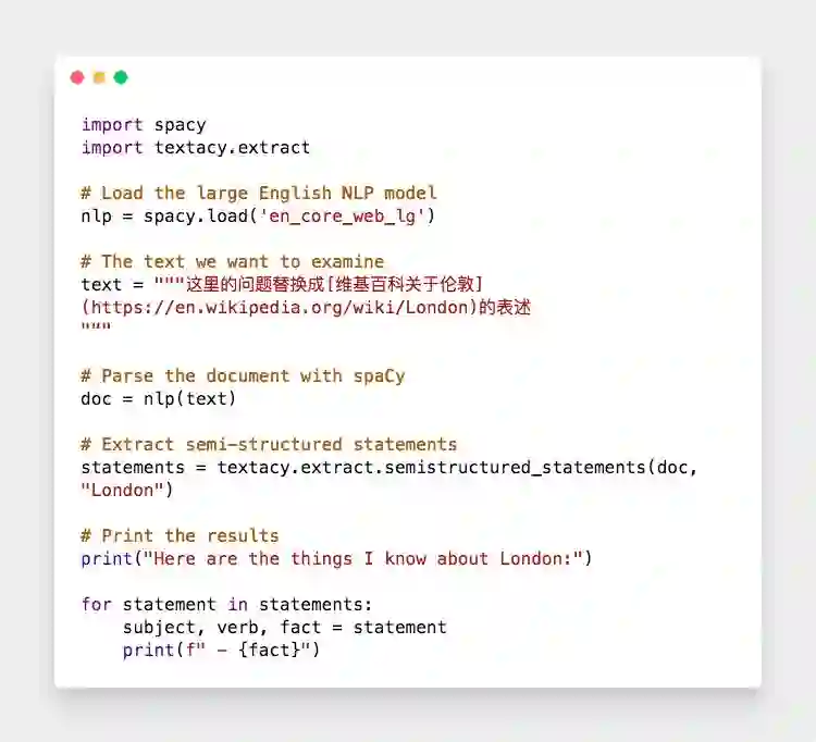 利用spaCy识别并定位的名词,然后利用textacy就可以把一整篇文章的信息都提取出来。我们在wiki上复制整篇介绍伦敦的内容到以下代码