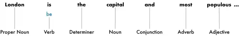 让计算机明白这个道理的过程,就叫做词形还原。对之前有关伦敦介绍的第一句话进行词形还原后,得到下图