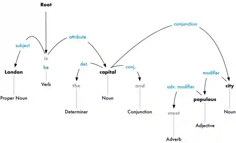 从这个关系树来看,主语是London,它和capital被be联系起来。然后计算机就知道,London is a capital。如此类推,我们的计算机就被训练的掌握越来越多的信息。