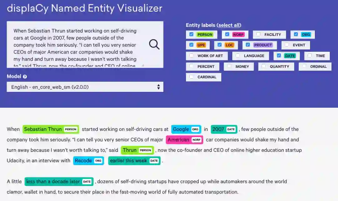 大家也可以通过下面的链接,在线体验一下。随便复制粘贴一段英文,他会自动识别出里面包含哪些类别的名词: