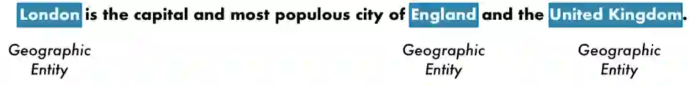 经过以上的工作,接下来我们就可以直接使用现有的命名实体识别(NER: Named Entity Recognition)系统,来给名词打标签。比如我们可以把第一句话当中的地理名称识别出来: