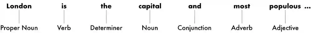 我们需要区分出一个词在句子中的角色,是名词?动词?还是介词。我们使用一个预先经过几百万英文句子训练、被调教好的词性标注(POS: Part Of Speech)分类模型:
