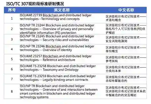 自 2017 年下半年以来,ISO/TC 307 正加速推动基础类、智能合约、安全隐私、身份认证、互操作等方向的重点标准研制工作。目前,包含术语和概念、参考架构、合规性智能合约等 8 项国际标准已完成立项,进入研制阶段。在这 8 项国际标准中,中国分别承担“分类和本体”(Taxonomy and Ontology)的编辑以及“参考架构”(Reference architecture)的联合编辑职务。