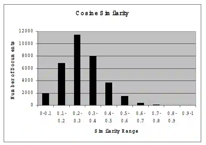 作者提出需要做Query扩展的原因是认为用户输入的Query词与实际文档集中的词存在差异,所以在传统BM25算法搜索的过程中很有可能无法命中。下图是作者做的验证工作,将文档和Query都使用词袋向量表示,向量中元素值为TF-IDF,可以看到峰值区间对应的相似度并不高。
