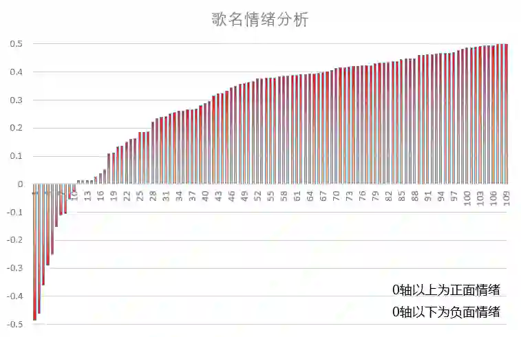 接下来,文摘菌开始了对歌名、歌词的情绪分析,通过对这些歌词的自然语言处理,我知道了不同歌手们吟唱的到底是开心还是不开心的事情。