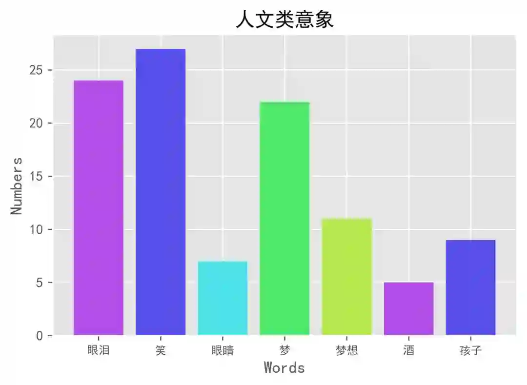 另外,天空、云、彩虹、夜也是歌曲中出现了较多的次数,包含天空的歌曲数目为21、风雨为21、云为4、彩虹为5、夜为9、星星为8。