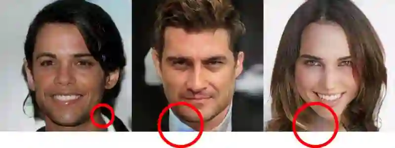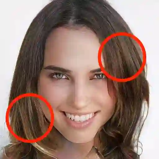 这是识别GAN生成图像最快方法之一。通常情况下,GAN会让头发看起来盘曲打结,在肩膀周围随机形成一缕一缕的发束,并在额头上留下厚厚的杂散毛发。发型可以非常多变,还可以拥有许多细节,因此它是最难以用GAN捕捉的特征之一。非毛发类物体有时甚至可以被变成头发状纹理。
