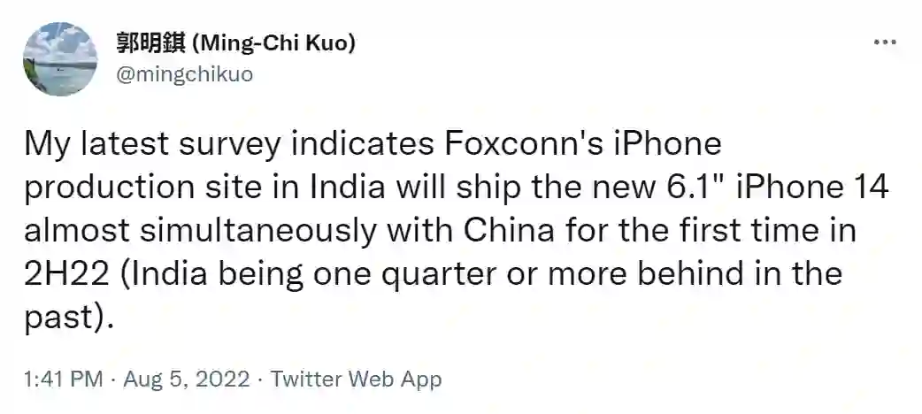 郭明錤表示,他的最新调查显示,富士康在印度的iPhone生产基地将在2022年下半年首次与中国同步出货新的6.1英寸iPhone 14。