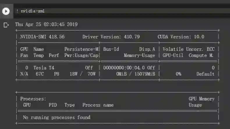 看到这条信息,小编也是挺激动的,终于有了更强大的免费算力,我们马上在 Colab 上查看 GPU 的使用情况。如下我们看到 Colab 现在确实使用的是 Tesla T4 GPU,而且显存也达到了 16 GB,比以前 K80 12GB 的显存又要大了一圈。