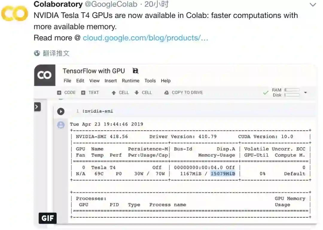 最近,Colab 在 Twitter 官方账户上表示,现在已经可以免费用 T4 GPU 了,它不仅能够提供更多的计算力,同时还提供更大的显存: