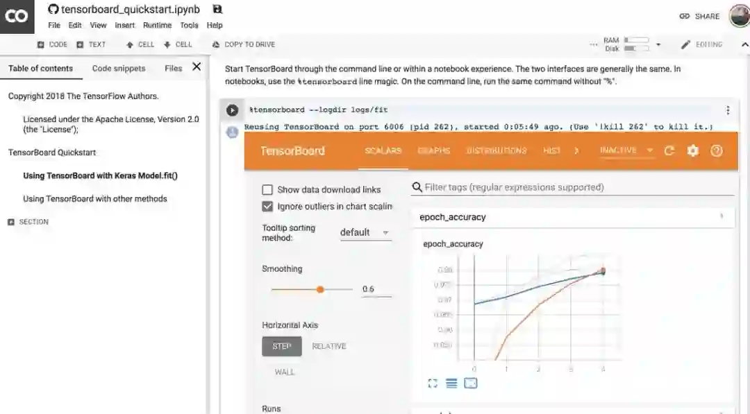 与此同时,Colab 也开始支持 TensorBoard,只需要使用魔术命令符「%」就能可视化训练过程。