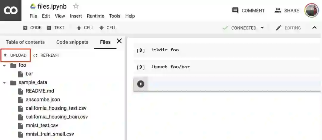 2018 年 10,Colab 加了一个文档浏览器。这非常便利,我们只需点击一下就可以上传和下载文件。