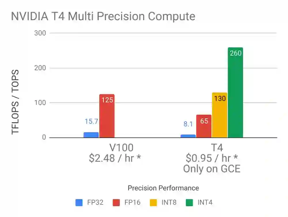 T4 GPU 可以很好地补充 V100 GPU,它虽然没有那么 V100 剽悍,但相比 K80 已经有很多进步了。而且由于 T4 非常节能,替换掉 K80 在能耗上也能降低不少。