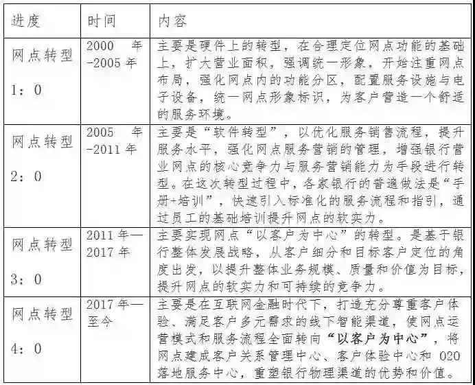 中国银行网点转型的前三个阶段都属于内视型改革,主要关注的是银行自身软硬件服务能力和竞争力的提升,关注的是网点自身业态与功能的调整。网点转型4.0版本属于外视型改革,主要围绕客户习惯与客户体验,倒逼银行物理渠道的进一步转型与升级。