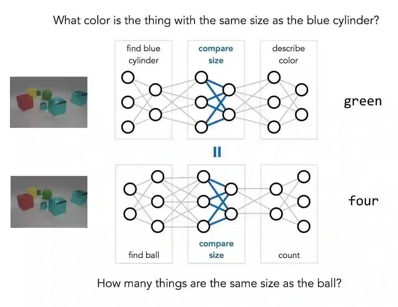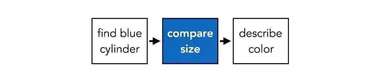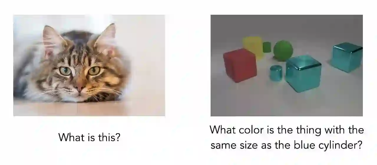即使是一张更简洁的图片,回答这样的问题仍需要多步推理。模型不能简单地识别图像中的主要物体,而是先要找到蓝色圆柱体,然后找到具有相同大小的另一个物体,再确定其颜色。