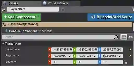 在世界大纲视图中找到 PlayerStart,设置位置如下: