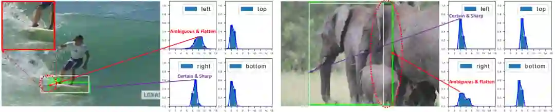 我们希望用一种general的分布去建模边界框的表示。问题二如图所示(比如被水模糊掉的滑板,以及严重遮挡的大象):