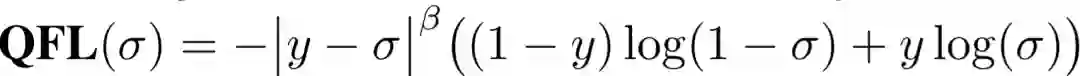 然而,对于我们的分类-质量联合表示,label却变成了0~1之间的连续值。我们既要保证Focal Loss此前的平衡正负、难易样本的特性,又需要让其支持连续数值的监督,自然而然就引出了我们对Focal Loss在连续label上的拓展形式之一,我们称为Quality Focal Loss (QFL),具体地,它将原来的Focal Loss从: