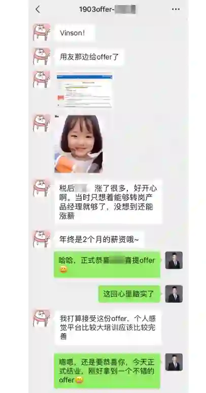 爱学习的人运气都不会太差,最终,在特训营的内推下,Joyce同学在10周特训结束的那一天就拿到了用友的产品经理offer。
