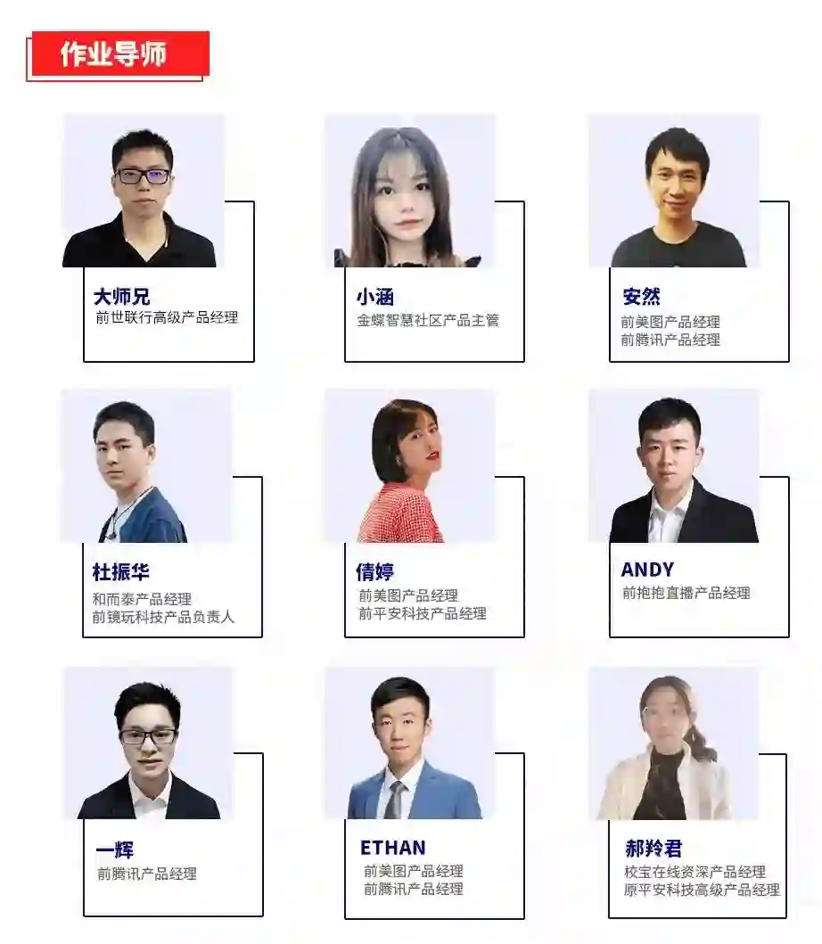 导师团均来自一线互联网大厂,他们久经打磨,专业知识过硬,同时洞察行业与市场,能带领你跟上行业趋势,学到的知识不过时。