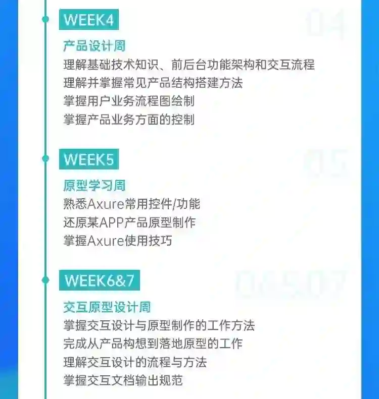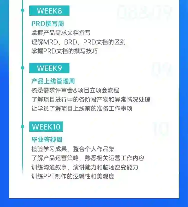 课程设置包含市场/竞品分析、用户研究、需求分析、产品设计、原型设计、交互设计、PRD撰写、产品上线管理等初级产品经理必备知识技能: