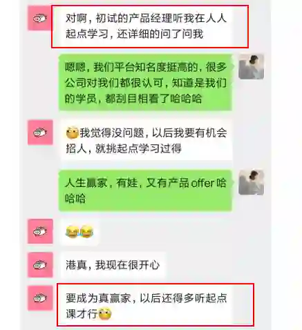 好在,着急赶上秋招而找到特训营来学习课程的小王同学最近收到了好消息,他告诉我们,面试他的产品总监对起点学院印象很好!
