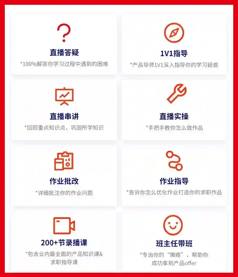 班主任还会帮你1V1定制学习时间&学习计划,实时跟进,随时为你答疑解惑,让你“咬着牙”也会把课程学完、学会、学好,最终入行/转行产品经理。
