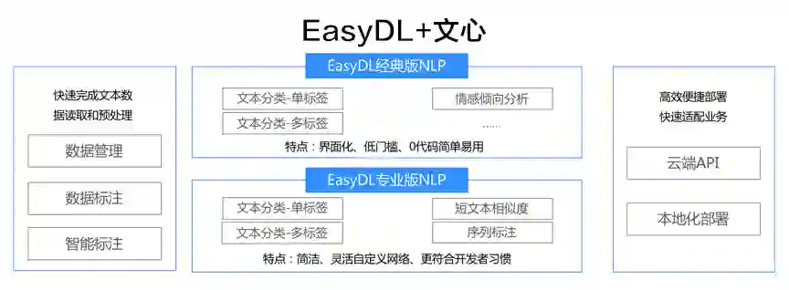 目前,EasyDL已预置了领先的预训练模型ERNIE2.0,并配套了多种NLP经典算法网络,支持了文本分类、短文本匹配和序列标注等典型文本处理任务。
