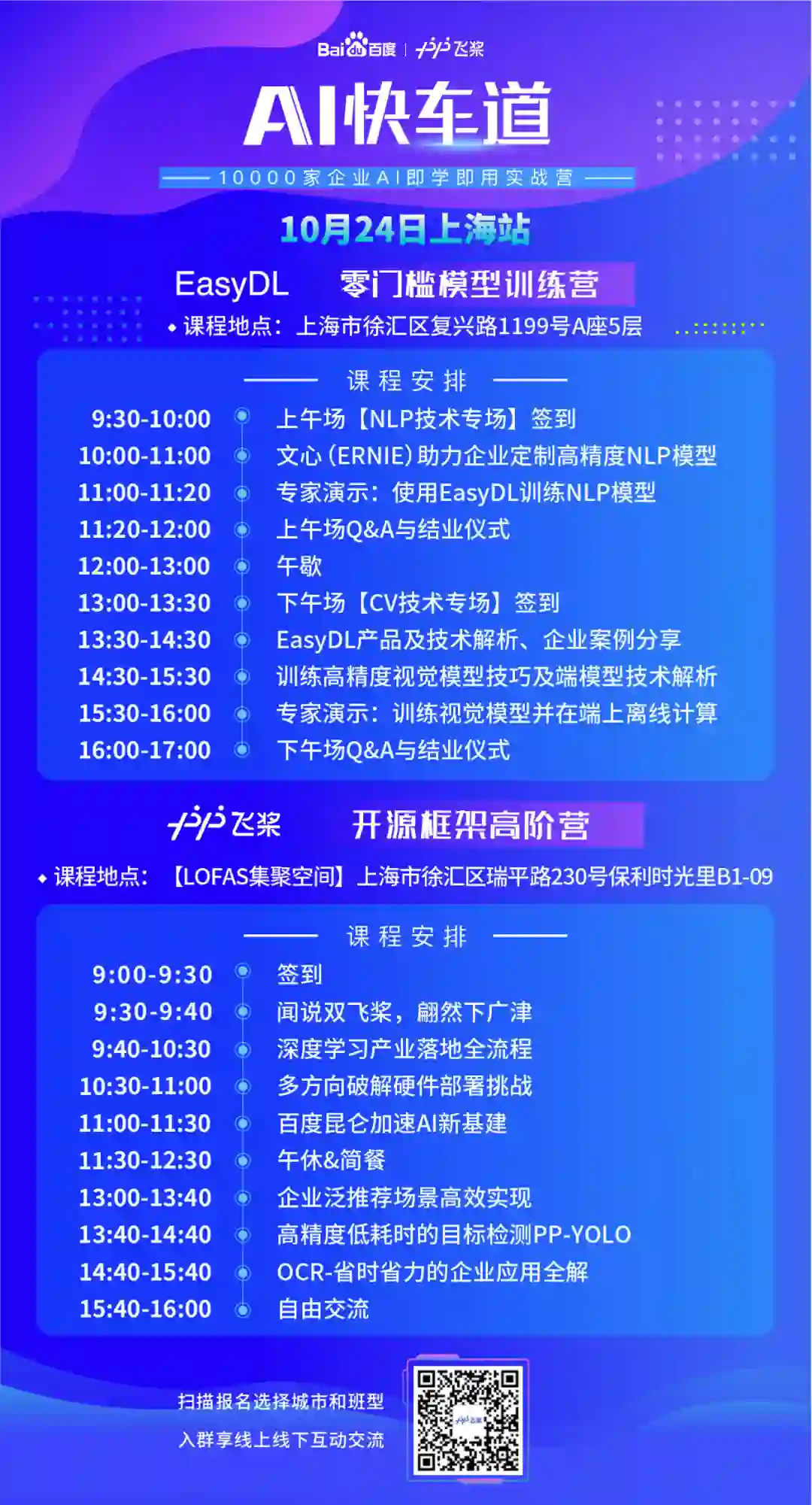 10 月 24 日当天,百度 AI 快车道【飞桨开源框架高阶营】线下课程 “闪现” 上海站,邀请 “魔都程序猿” 和 “沪上程序媛” 来到上海市徐汇区瑞平路 230 号保利时光里 B1-09——LOFAS 集聚空间,与百度资深高工、各位行业开发者相聚一堂。上海站内容绝对不会令你 “空脑而归”,开发全流程、部署工具、高精度目标检测、模型优化方案一一奉上,更有“全能”OCR、金牌推荐算法,一起来场硬核趴体吧!