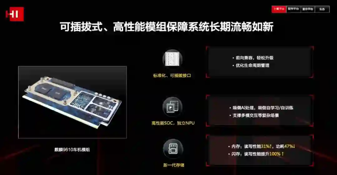 一块可升级的中控屏,一套支持插拔更换的域控制器,再到可升级激光雷达甚至动力电池这些大件,可以把一辆新能源车的寿命周期拉得比燃油车还长。目前已经有不少车企(当然主要是新势力)在往这个方向努力,主要集中在智能座舱领域。