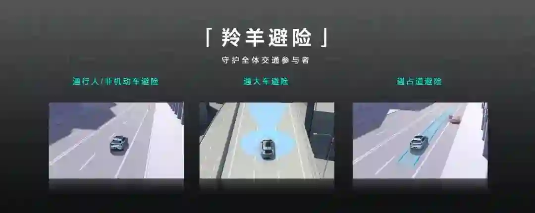智能驾驶域升级了 0-130km/h 范围内的全速域主动巡航能力,优化了拥堵场景防加塞和智能过弯项目,提升了车道线识别居中能力。此外,在遇到行人、非机动车、大型车辆和占道车辆时,主动巡航提供车道内主动规避的“羚羊避险”功能。