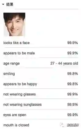 识别结果分类中有:脸部识别概率,性别,年龄范围,情绪的分析,是否戴眼镜,眼睛和嘴巴是否张开。玩到这里,是不是按耐不住已经打算上传一张自己的图片一测究竟呢?