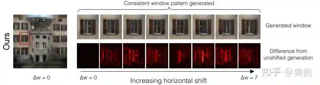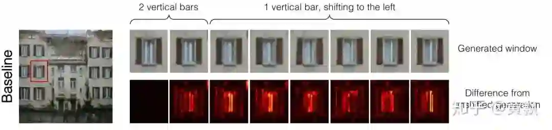 上图是对于一个窗户分别采用从0~7的平移量,其特征图与不平移的差异,可以明显看到,特征图出现了波动。相应地,上半部分是利用pix2pix生成的图像,我们可以看到随着平移量的增大,窗户中的竖直线从两根变成了一根。这一点就表明传统的CNN网络并不具有平移不变性。