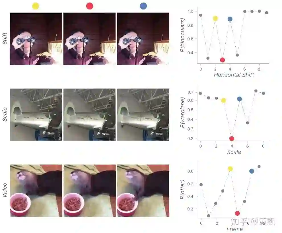 第二篇是同年发表在JMLR的一篇论文《Why do deep convolutional networks generalize so poorly to small image transformations?》。作者首先给出了几组示例,分别表示了平移、尺度以及轻微图像差异对网络预测分类置信度的影响: