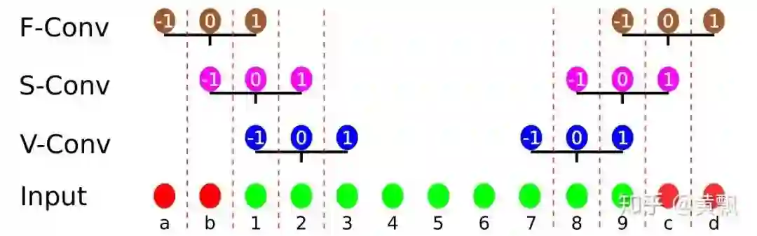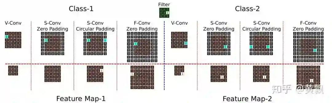 其中红色部分表示padding,绿色部分表示边界区域。很明显,valid模式下卷积核最右边的1永远无法作用于绿色部分的1,same模式下的卷积核最右边 1永远无法作用于绿色部分的1 。作者以zero-padding和circular-padding两种模式做了一个例子说明:
