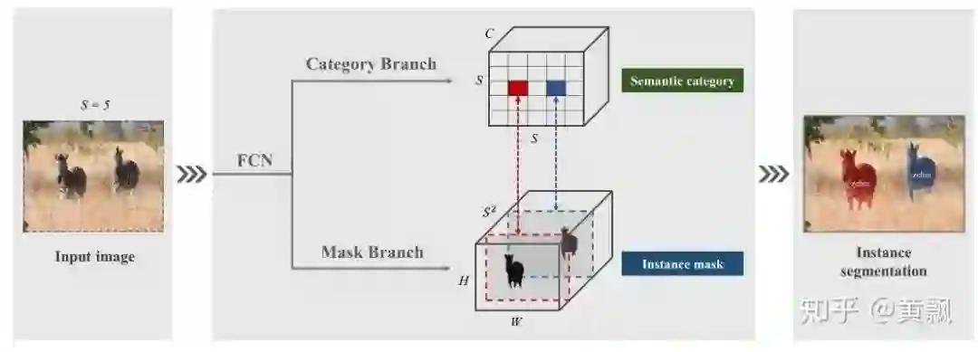 也有一些研究探索了如何让CNN结合绝对位置信息,比较出名的应该是当前很热门的SOLO单阶段实力分割算法。SOLO的出发点很简单,我们都知道语义分割只需要分割出不同类别的目标,而实力分割对于同一类别的个体还需要区分。但是显而易见,同一类别的目标只要位置和形状不同则可以区分。因此SOLO就是将位置和形状(用尺寸简化)信息结合进来。具体而言,就是将输入系统的图像统一划分为S x S的网格,如果对象的中心落入网格单元,那么这个网格单元就负责预测语义类别以及分割该对象实例。